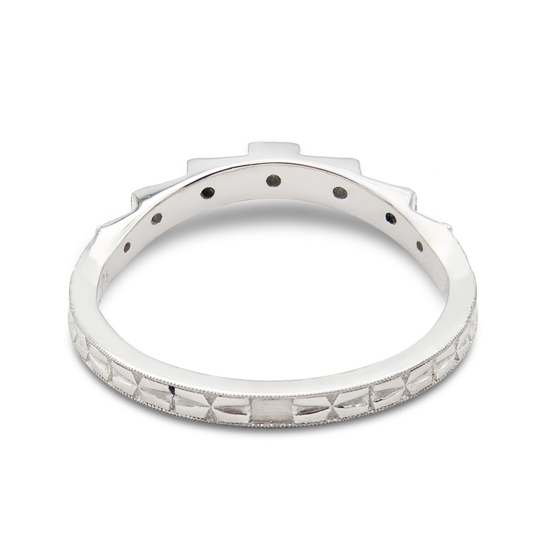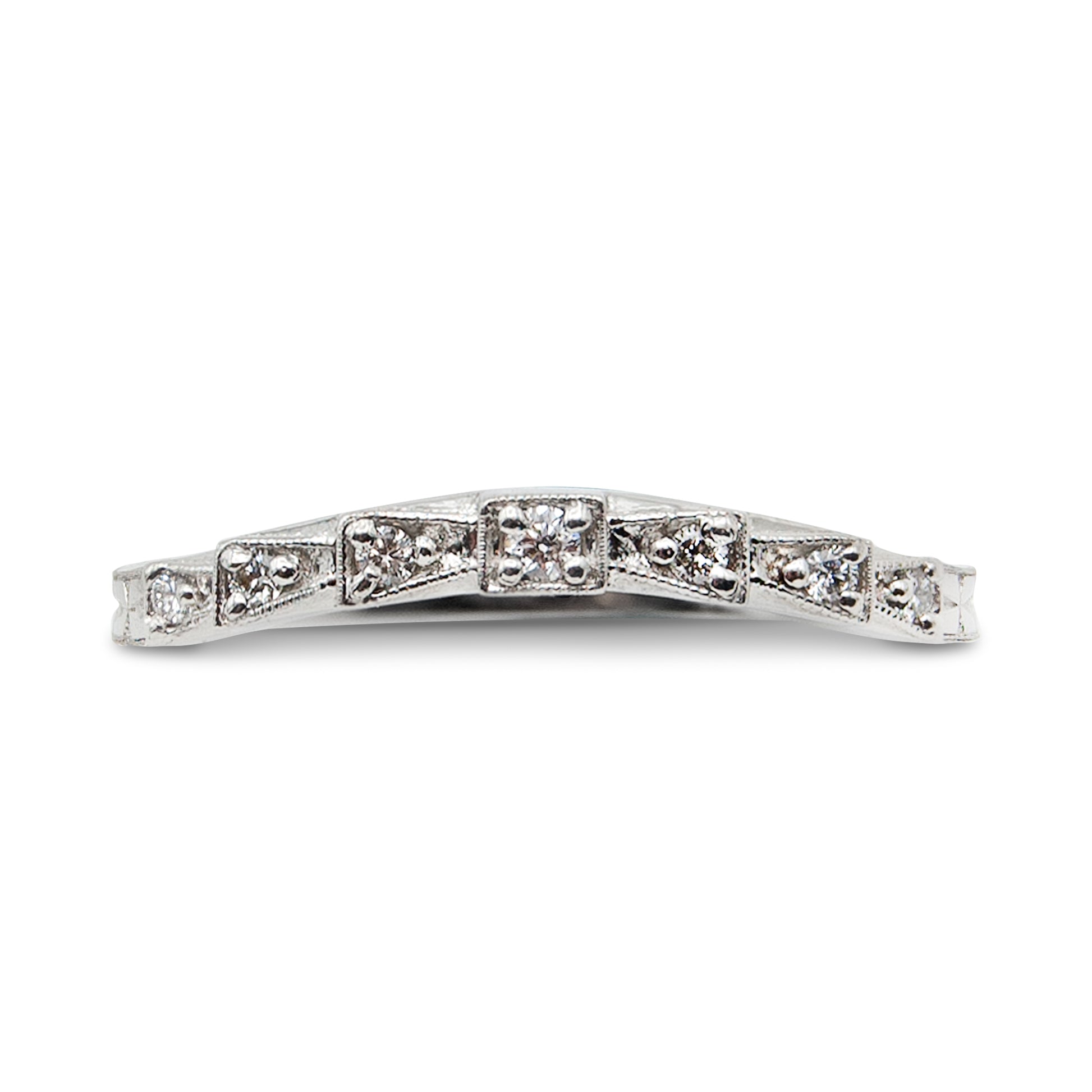 A custom platinum and diamond wedding band inspired by classic Art Deco styles. The band has a slight contour which allows it to fit perfectly with another ring.