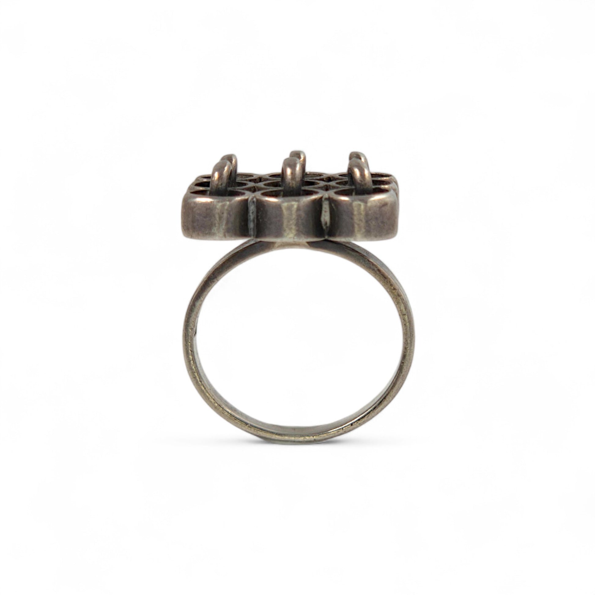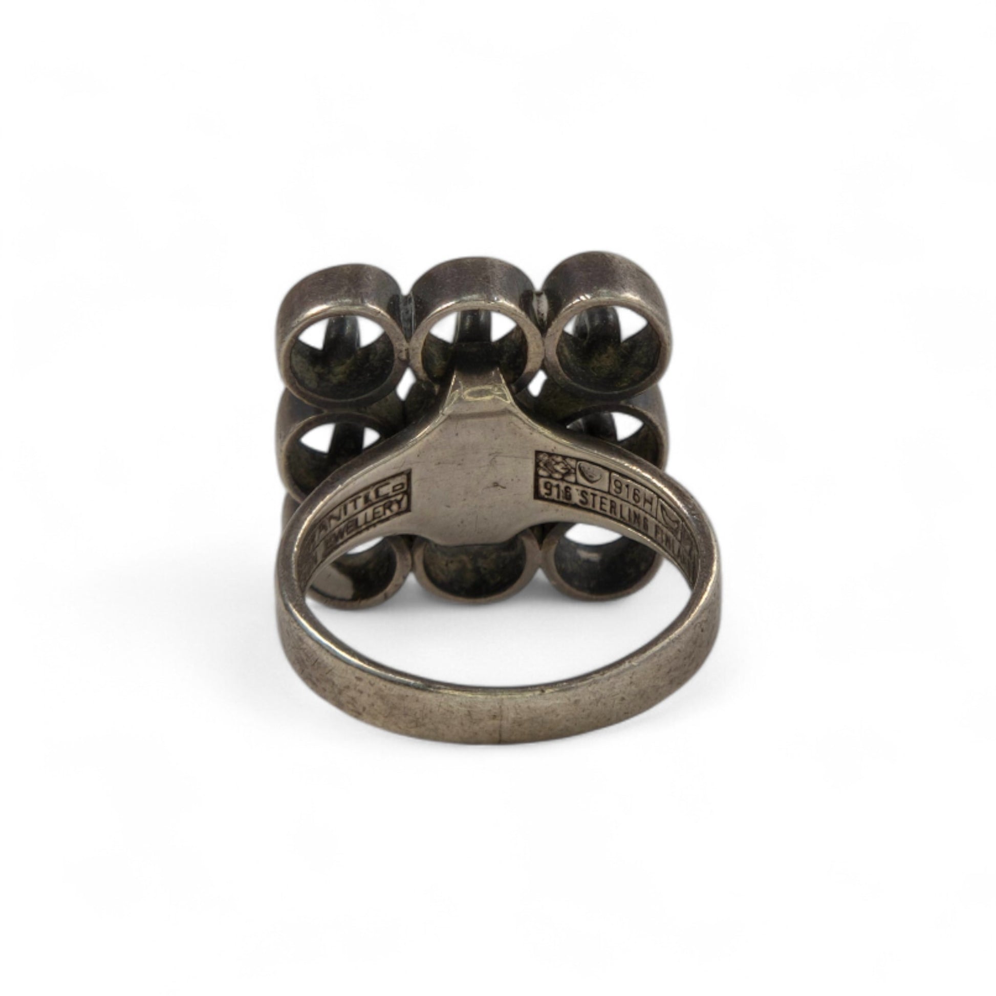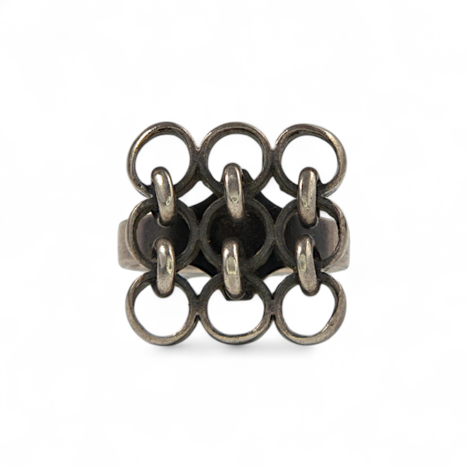 This sterling silver ring was made by Finnish jewelry designer Erik Granit under his workshop's brand, E. Granit & Co. The top of the ring features a bold, chainlink-like design of interlocking silver rings.