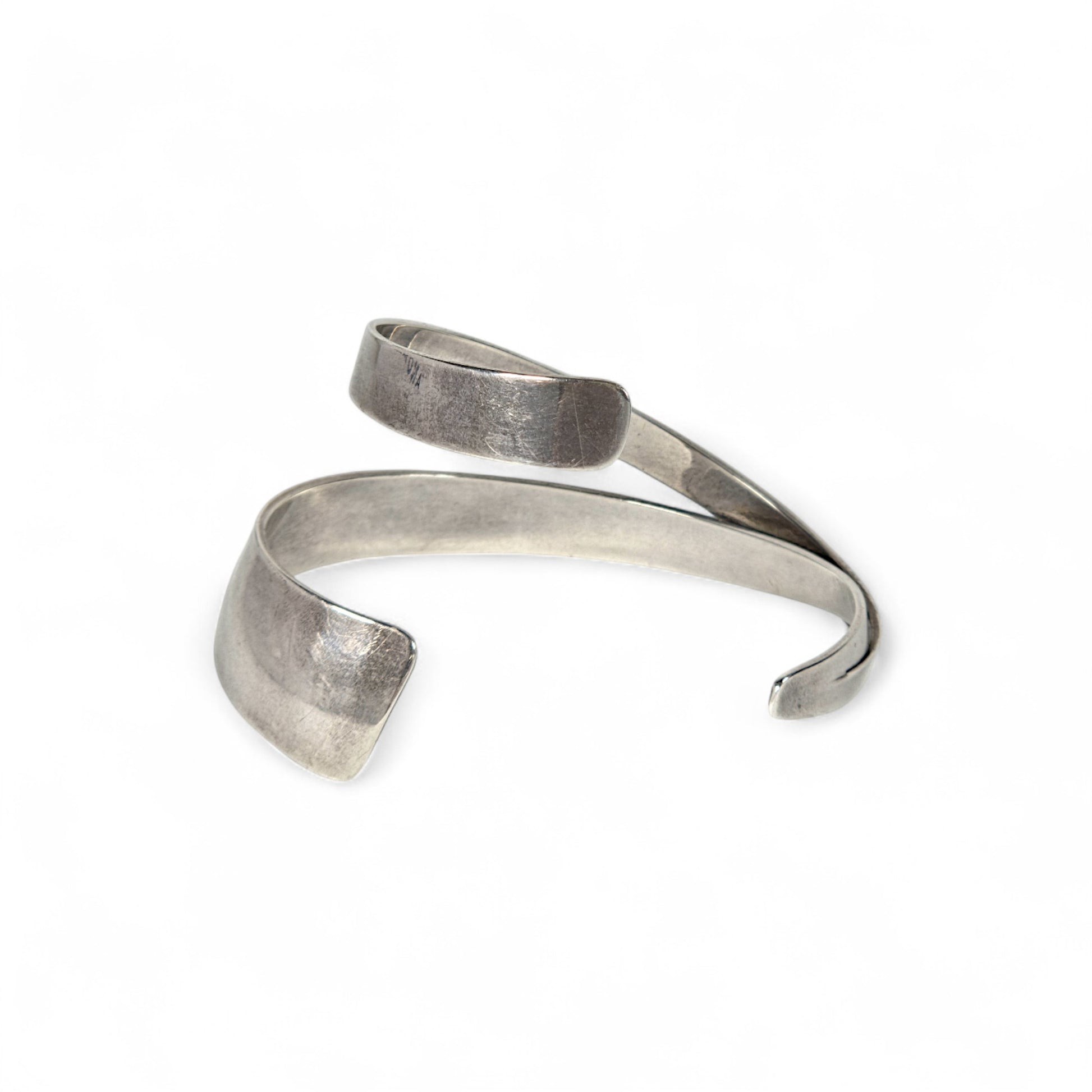 A cuff bracelet with a swirl-like effect by American jewelry designer Gerhard Herbst. The bracelet twists gracefully around the wearer's wrist and features a wonderful use of negative space.