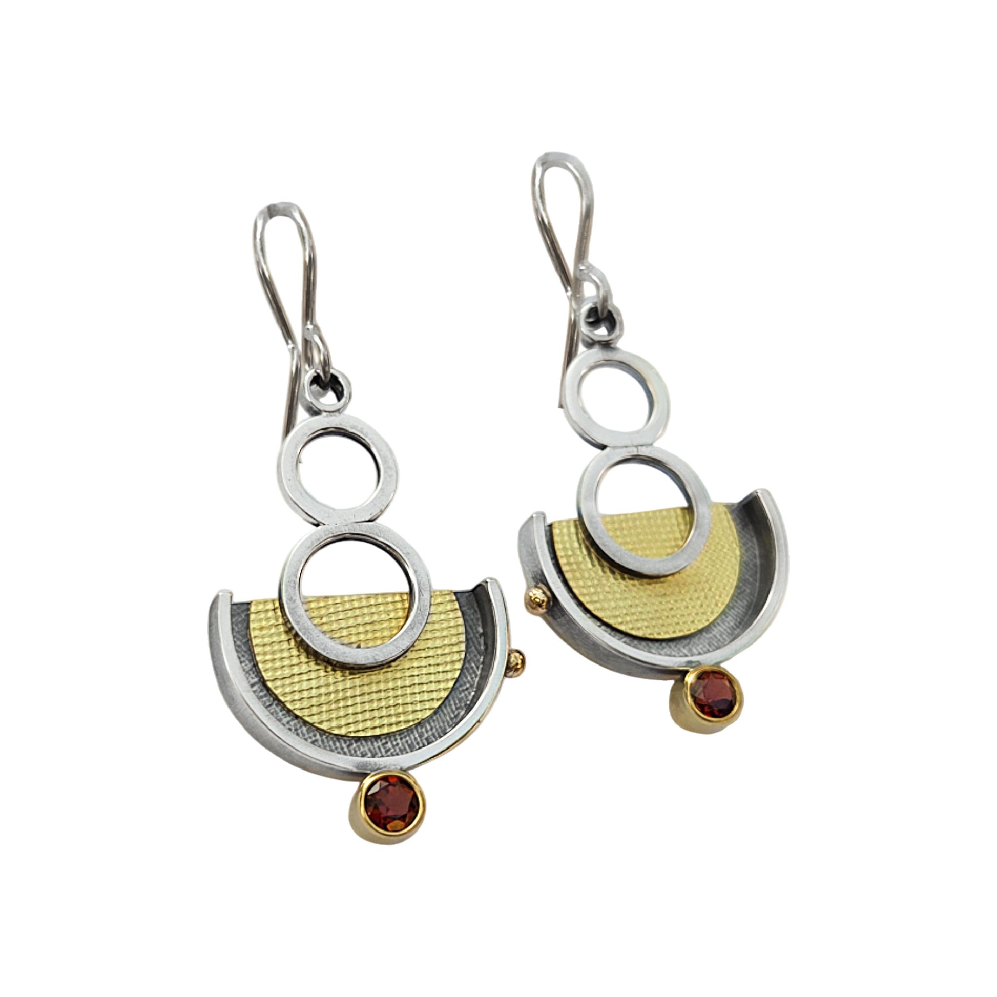 Details: Sterling silver and 14k yellow gold. Bezel set 4mm round rhodolite garnet gemstones. Earrings measure approximately 1.75 inches long.